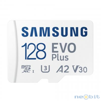 Samsung EVO Plus MB-MC128SA/EU microSDXC spominska kartica s kapaciteto 128 GB in vmesnikom UHS-I. Ponaša se s hitrostjo branja do 160 MB/s, razredi U3, V30 in A2 za predvajanje 4K video posnetkov in aplikacij. Združljiva z Android napravami, tablicami, prenosniki in igralnimi konzolami. S priloženim SD adapterjem.